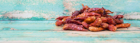 Dry red chili peppers on a wooden rustic table.