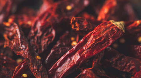 Close-up of dried red chili peppers showcasing rich textures and colors. Ideal for culinary use, this image captures the essence of spices in cooking and decoration.