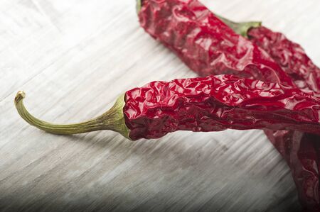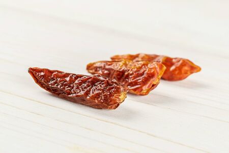 Group of three whole dry red chili pepper peperoncino in row on white wood