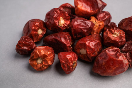 Smoked Dried Spanish Nora Peppers on gray textured background. Whole vegetable. Popular spicy condiments. Top view, copy space.