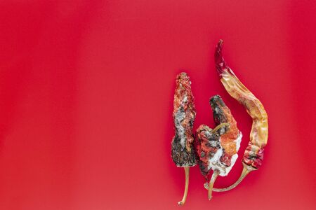 Rotten bitter pepper on a red background