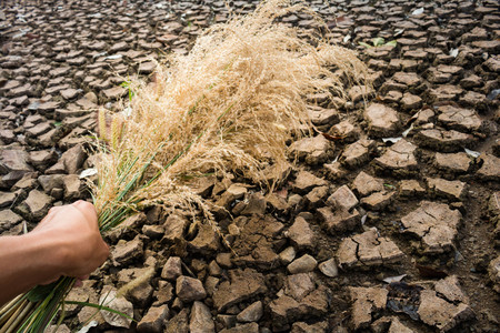 Landscape Dry cracked earth with dead crop plant at agriculture fields. High temperature and heatwave on summer exacerbate drought, impact to agricultural.