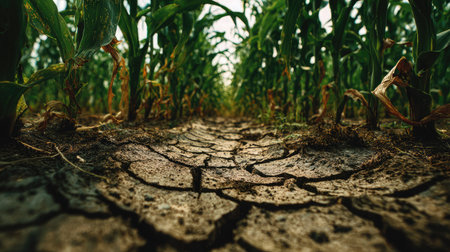 Close-up of cracked and dry soil beneath healthy green corn plants during summer