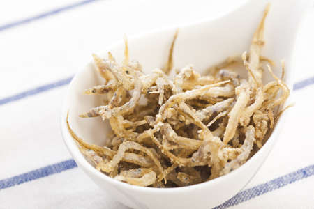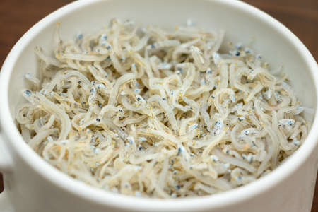 Japanese cuisine, boiled and dired young sardines in the bowl