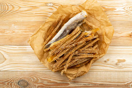 Dried fish mix top view. Dry salted seafood snacks, yellowstripe scad, hake stockfish, dehydrated pollock, beer snacks, dried fish fillet