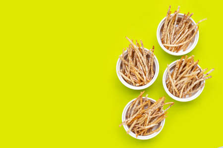 Dried anchovy on yellow background.