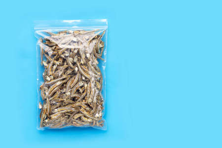 Dried anchovy plastic bag on blue background.