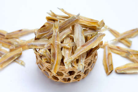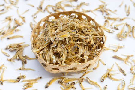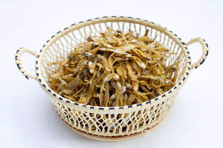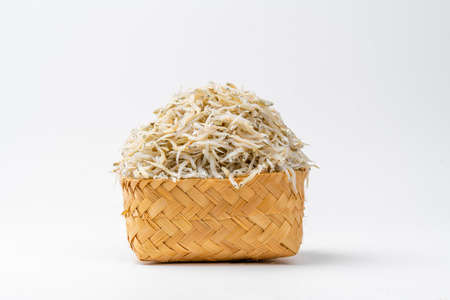 Dried anchovy in bamboo basket on white
