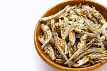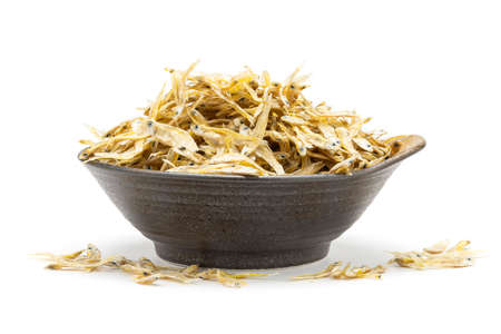 Dry anchovy (stolephorus indicus) fish in ceramic bowl isolated on white background.