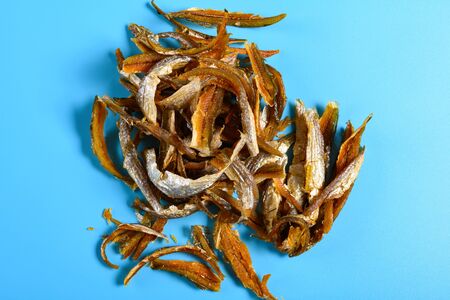 top view dry salty fishes on a blue background