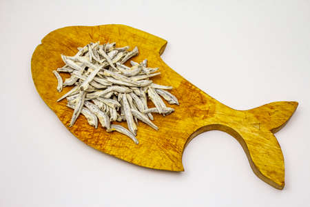 Dried salted anchovies on wooden cutting board isolated on white background. Traditional snack, appetizer for beer