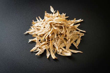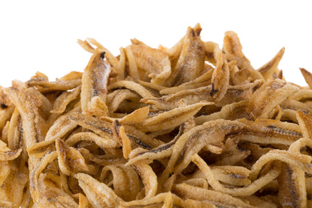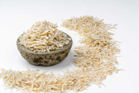 asian traditional dried salty small fish, calcium cooking, isolated on white background