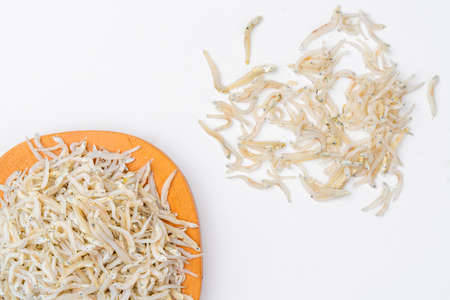 Fresh dried anchovies on White Background. Raw dry salted sea fish. saltwaterforage fish. Ikan asin teri medan.