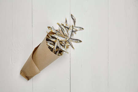 Dried small salted sprat or kilka fish in paper bag on white wooden table background. Top view, copy space.