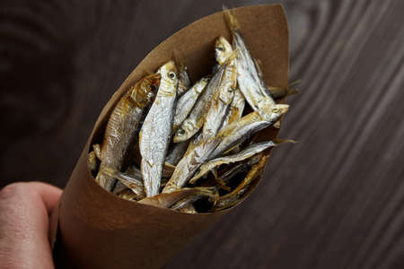 Dried small salted sprat or kilka fish in paper bag on dark wooden table background. Beer snack.