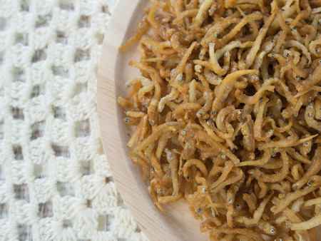 Small dried fish on the sack background, Crispy fish for snack
