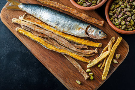 A beautifully arranged wooden board showcases dried fish alongside various traditional snacks.