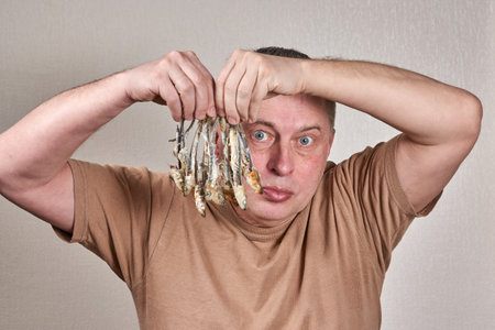 A man holds in his hands a lot of fish gnawed to the bone