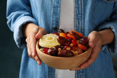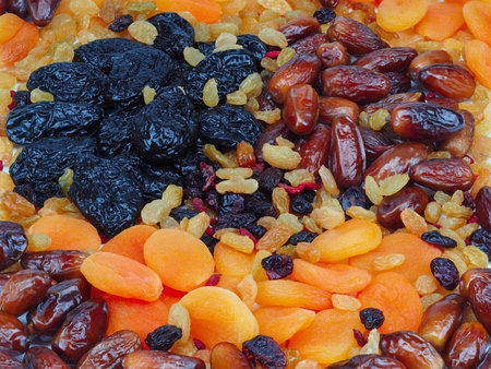 A variety of dried fruits, apricots, prunes, cranberries, raisins, figs, and dates for a healthy breakfast. A dried fruit mix as a food background for your design