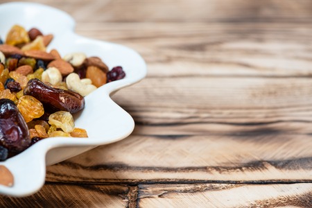 Plate of dried fruits on wooden table, Mix of nuts and berries: cashews, hazelnut, almonds, yellow, brown and blue raisins raisins, cranberries, dried dates and apricots. Healthy food and vitamins