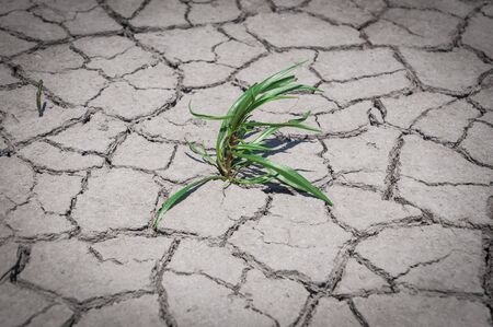 Green plant grow in middle dry cracked earth. recovery environmental from damage of climate change and human activities concept.
