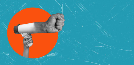 An artistic art collage featuring a hand holding a megaphone with a clenched fist instead of the megaphone on a blue background. The concept of intimidation and propaganda.