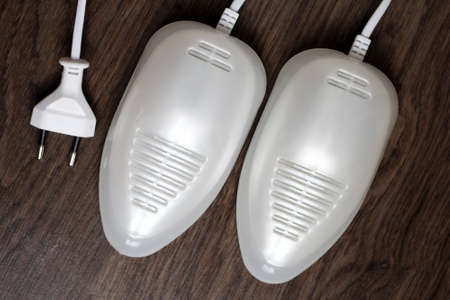 Electric ultraviolet shoe dryer on wooden table. White color.