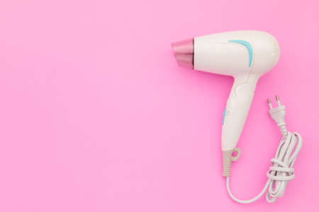 Top view new white hair dryer with cable on pink background with copy space for text or design