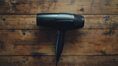 A sleek black hair dryer positioned on a rustic wooden surface, showcasing its modern design and functionality, ideal for beauty and personal care visuals.