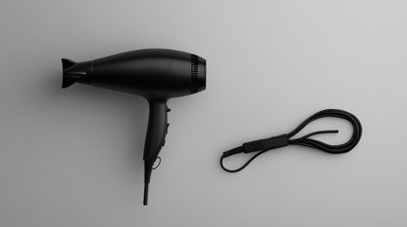 A minimalist black hair dryer rests on a smooth gray surface, complemented by its detachable cord, showcasing modern design and efficient functionality perfect for beauty enthusiasts.