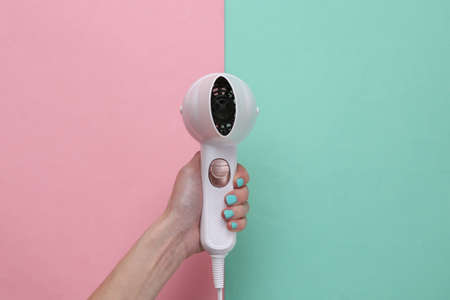 Woman hands with hair dryer on blue pink background. Beauty concept