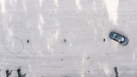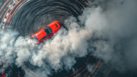An overhead shot depicts a red car engaged in drifting, generating a cloud of smoke. The vehicle is positioned on a circular track, with visible tire marks and concrete barriers. The scene is illuminated with natural light, showcasing a dynamic composition suitable for commercial or editorial applications.