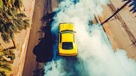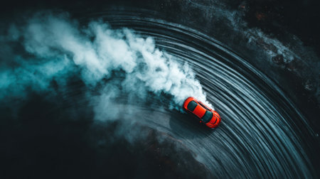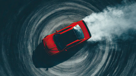 A red sports car is captured from above as it drifts on a paved surface, generating a large cloud of white smoke. The image showcases the car's dynamic movement, the composition highlighting its form. The style suggests an outdoor setting during the day, ideal for automotive or action-related commercial content.