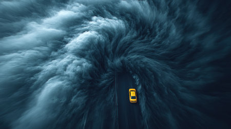 A striking overhead shot captures a yellow vehicle traversing a road enveloped by dark, swirling clouds. The composition features contrasting colors and textures, creating a dramatic visual effect. The scene evokes a sense of movement and immersion, suitable for various commercial applications or editorial uses.