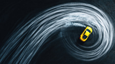 A top-down view showcases a yellow miniature car leaving a swirling white trail against a dark backdrop. The composition features dynamic lines suggesting motion, possibly indicating speed or movement. The image utilizes contrasting colors, and could be utilized for various commercial and editorial projects requiring a visual of speed or concept.