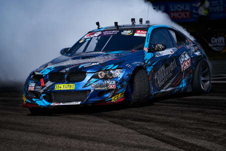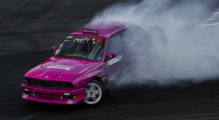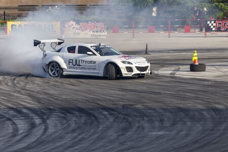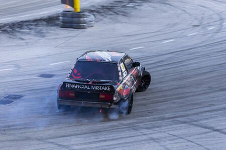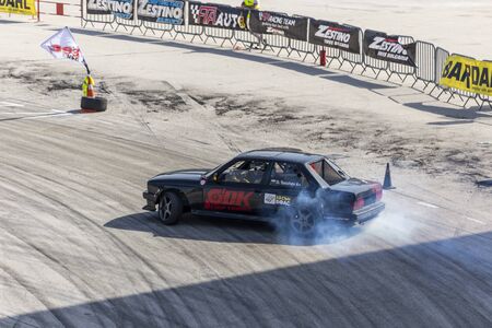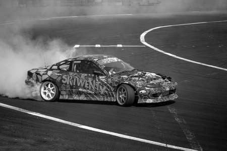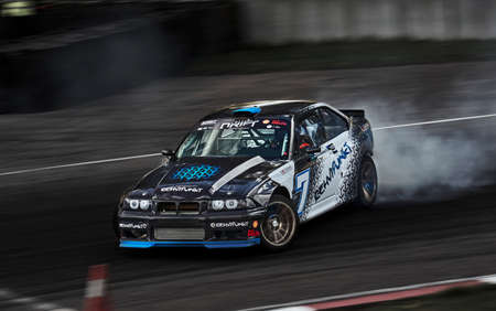 Odessa, Ukraine - August, 12, 2012. Ukrainian Drift Championship, 3rd stage, East European Drift Championship, 5th stage. Drift sport car in sharp sideslip. A lot of smoke