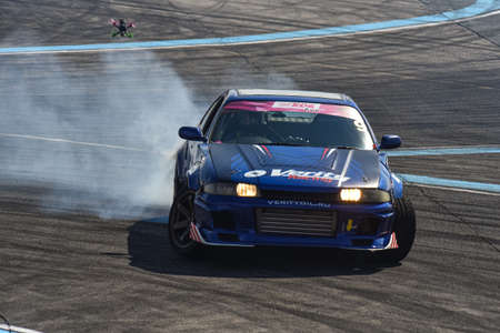 VLADIVOSTOK, RUSSIA - OCTOBER 02: Car drift, Sports car wheel drifts and a lot of smoke on the track. Russian drift show RDS without borders on October 02, 2021.