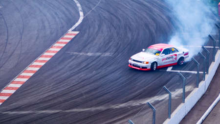 Race drift car burning tires on speed track
