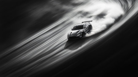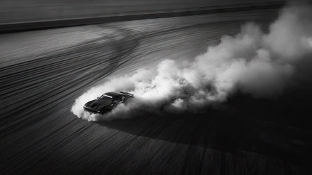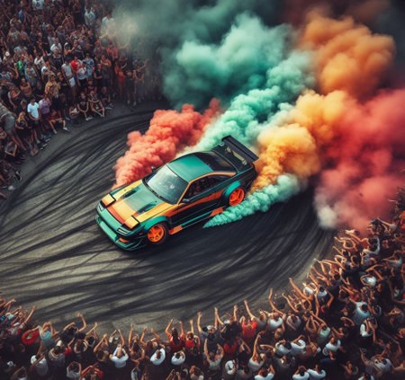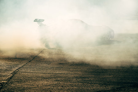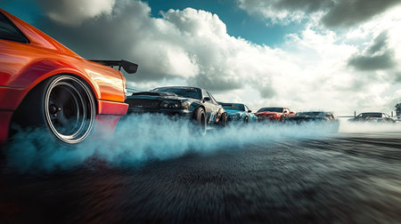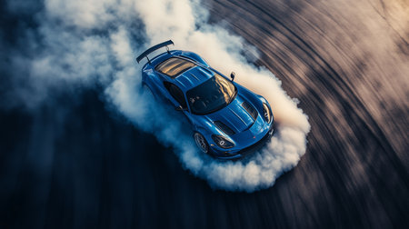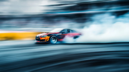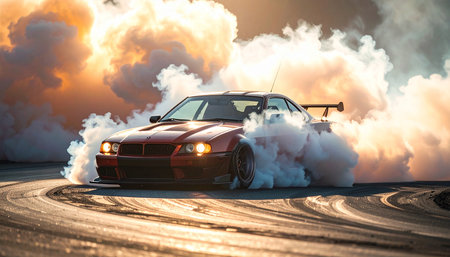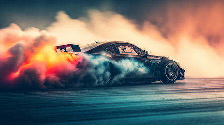 A powerful racing car performs a thrilling drift, creating dramatic smoke clouds on the asphalt. The image captures the essence of speed and adrenaline in motorsport.