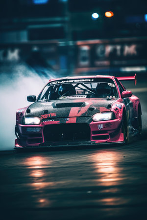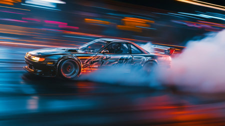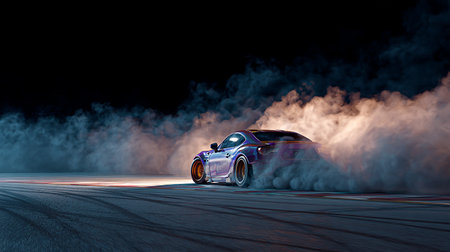 A stunning image capturing the essence of car racing at night, showcasing a sleek vehicle in motion amid smoke and vibrant lights.