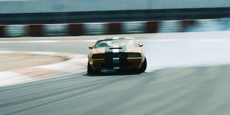 generic sports car performing burnout, drifting on racing track with smoke