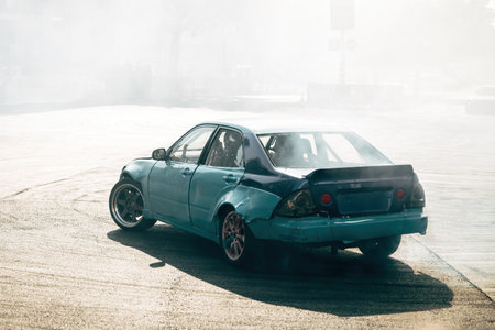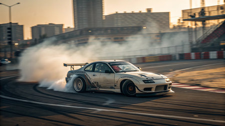 a modified drift car slides through a smoky turn on an urban racetrack during sunset showcasing speed control and motorsport energy
