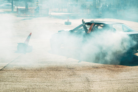 Car drifting on asphalt road, creating huge cloud of smoke during motorsport action. Selective focus.