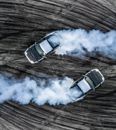 Aerial top view car drifting diffusion race drift car with lots of smoke from burning tires on speed track, Professional driver drifting car with lots of white smoke .