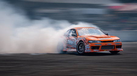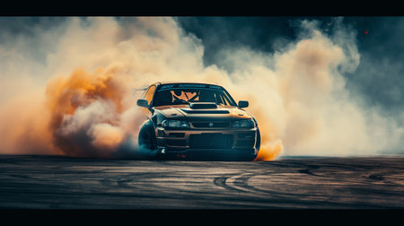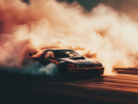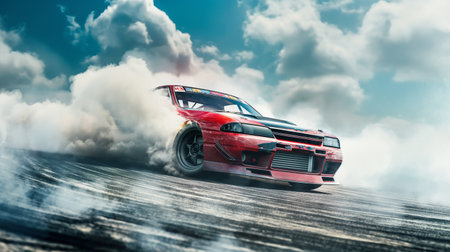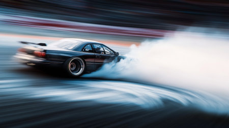 A powerful racing car performs a thrilling drift, creating dramatic smoke clouds on the asphalt. The image captures the essence of speed and adrenaline in motorsport.
