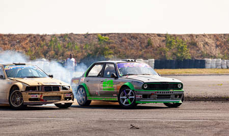 VLADIVOSTOK, RUSSIA - OCTOBER 02: Two Cars drift, Sports cars wheel drifts and a lot of smoke on the track. Russian drift show RDS without borders on October 02, 2021.