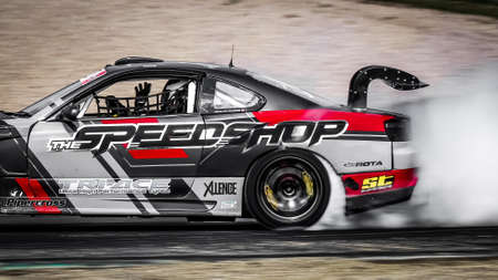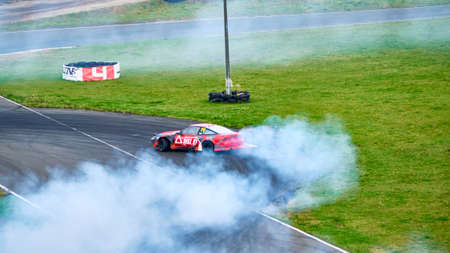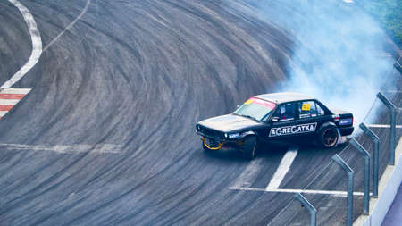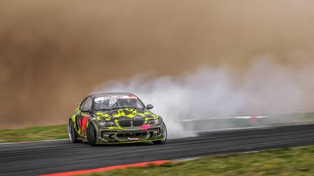 AutodromSpb, Saint-Petersburg, Russia - August 15, 2018: Powerful race car drifting on speed track during First Stage of Russian Drift Series West