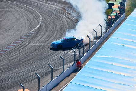 21-05-2022 Riga, Latvia car drifting on asphalt racing track with lot of smoke, motion blur drift car..