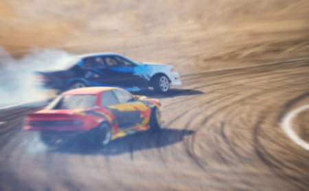 Blurred racing drift cars on a turn of a high-speed track. Competition