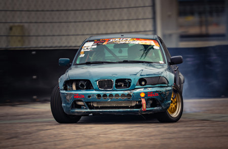 Latvia, Riga 03-05.10.2025. FIA Drifting cup. A blue car with a lot of smoke coming out of it. .